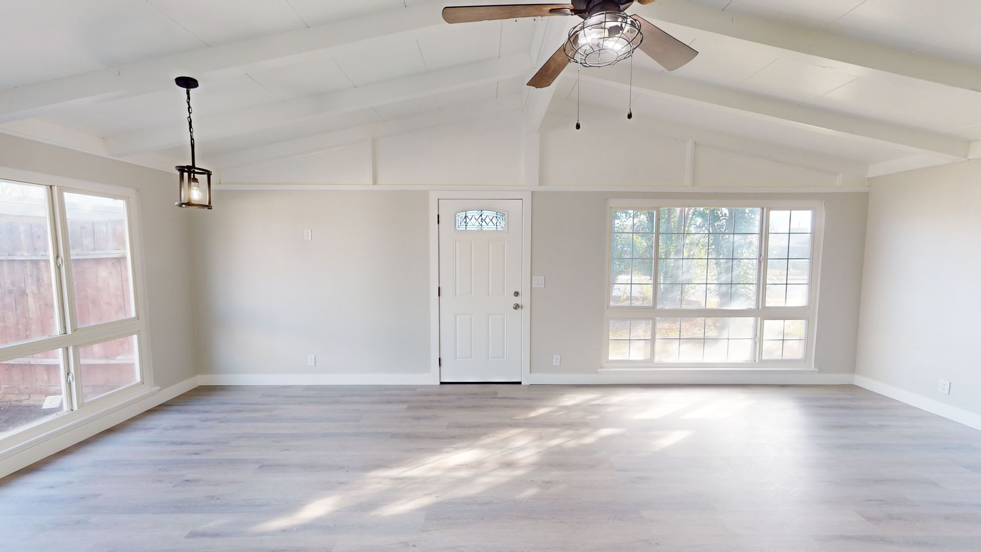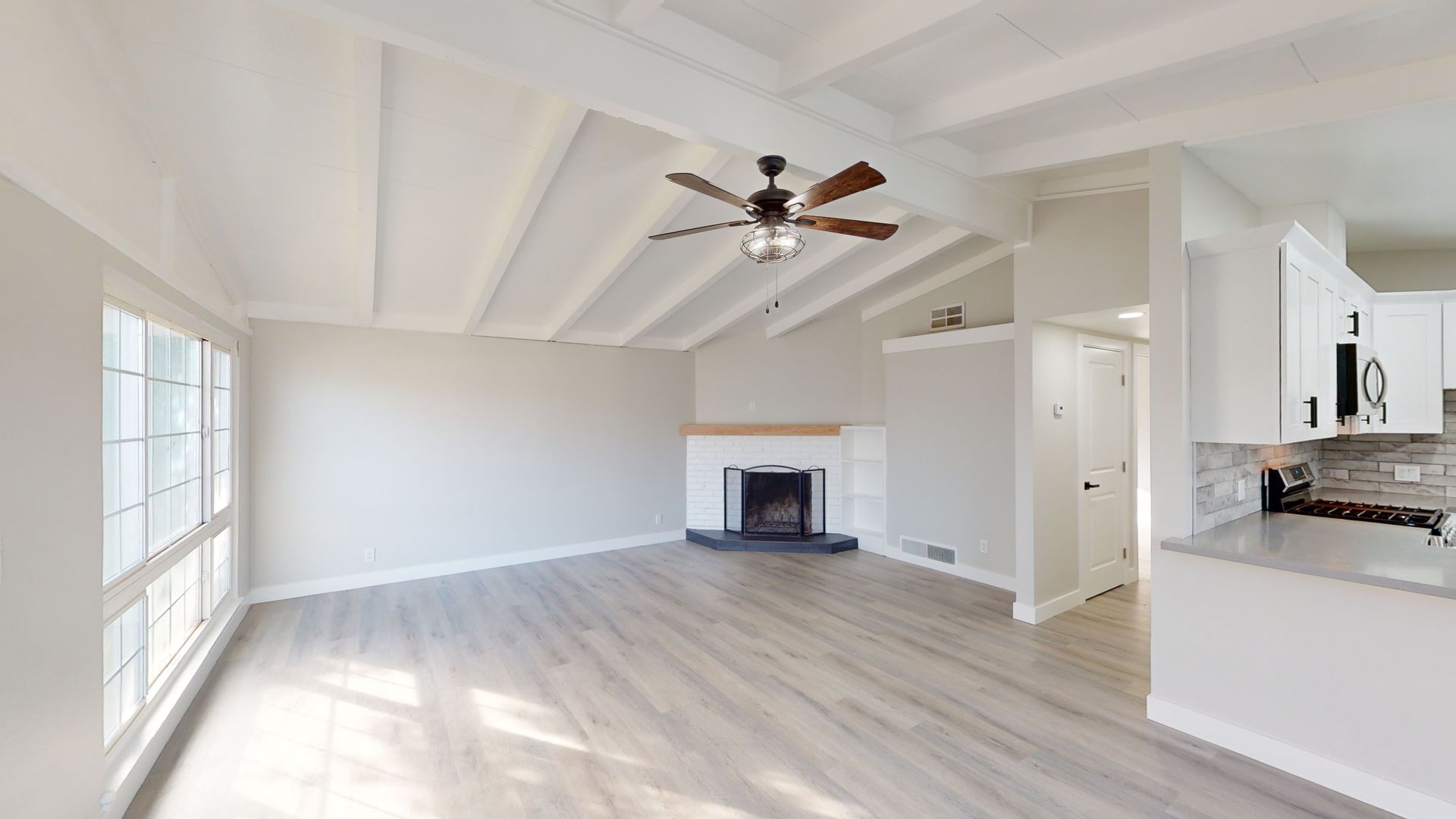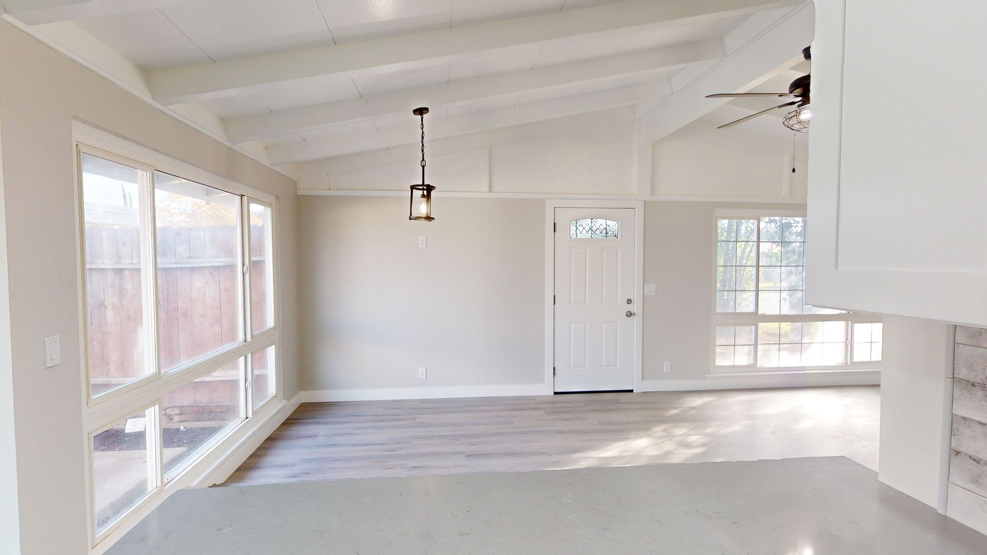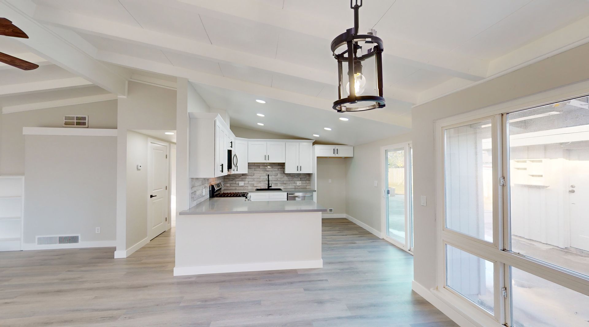 This is tastefully remolded home from the ceiling to the floors, it does not disappoint. Spacious open floor plan beautiful beamed ceiling and laminate flooring.
