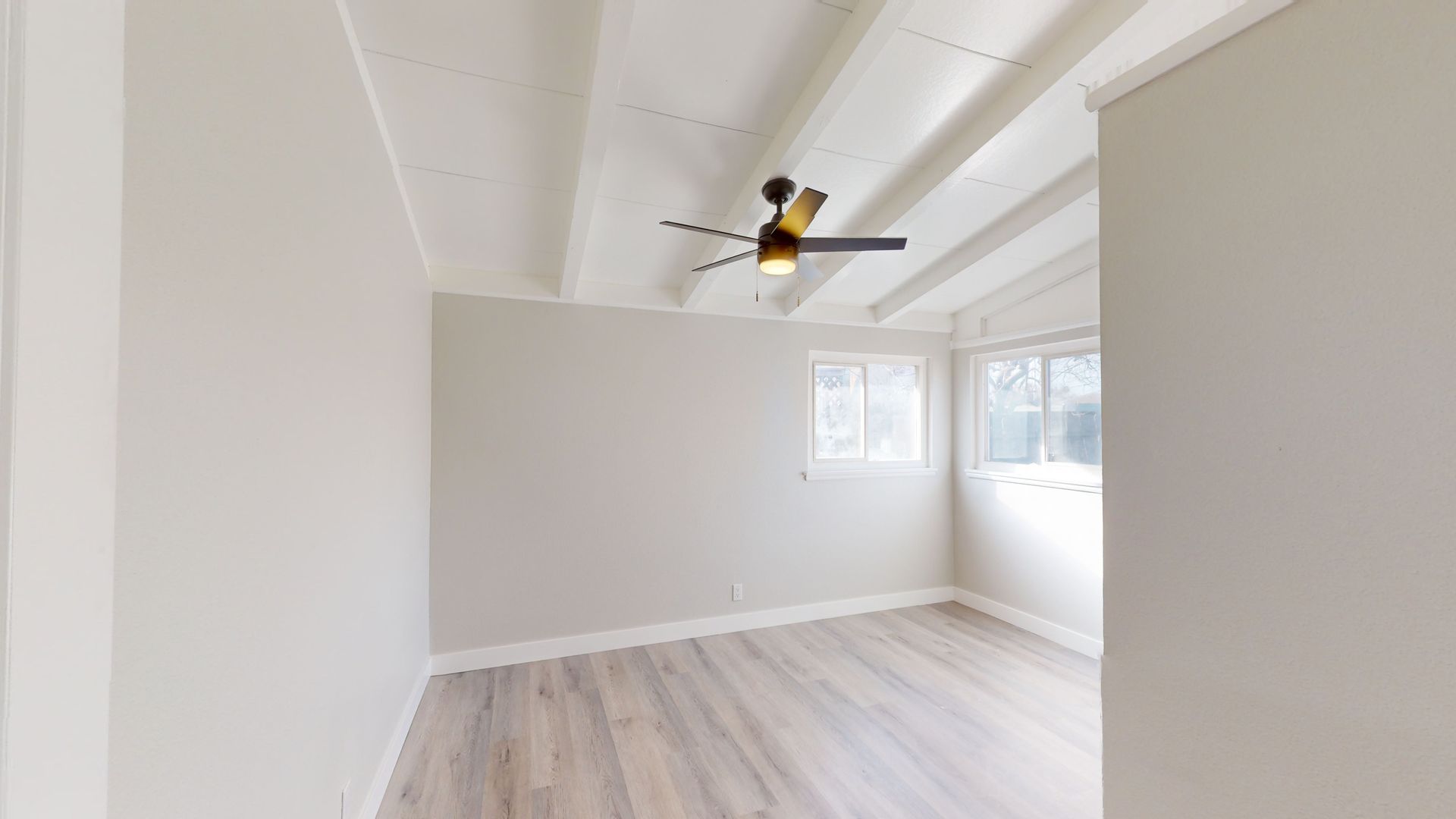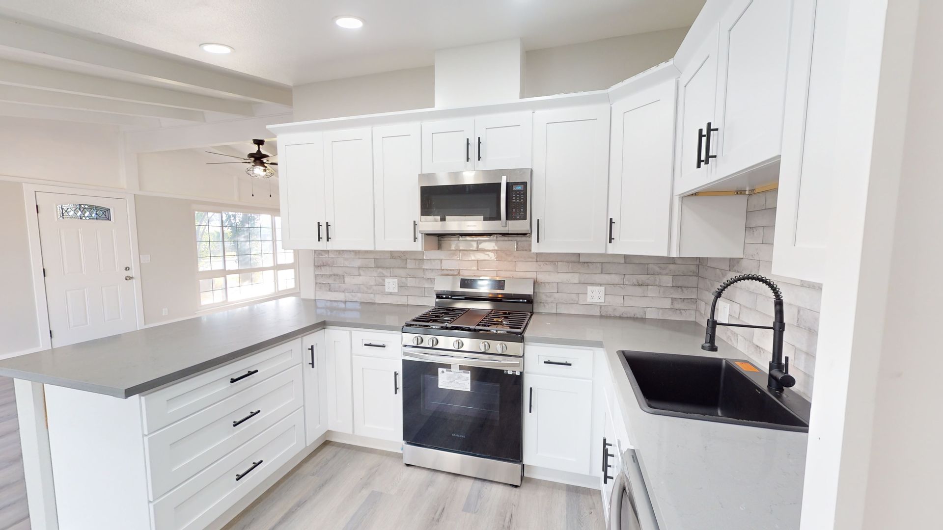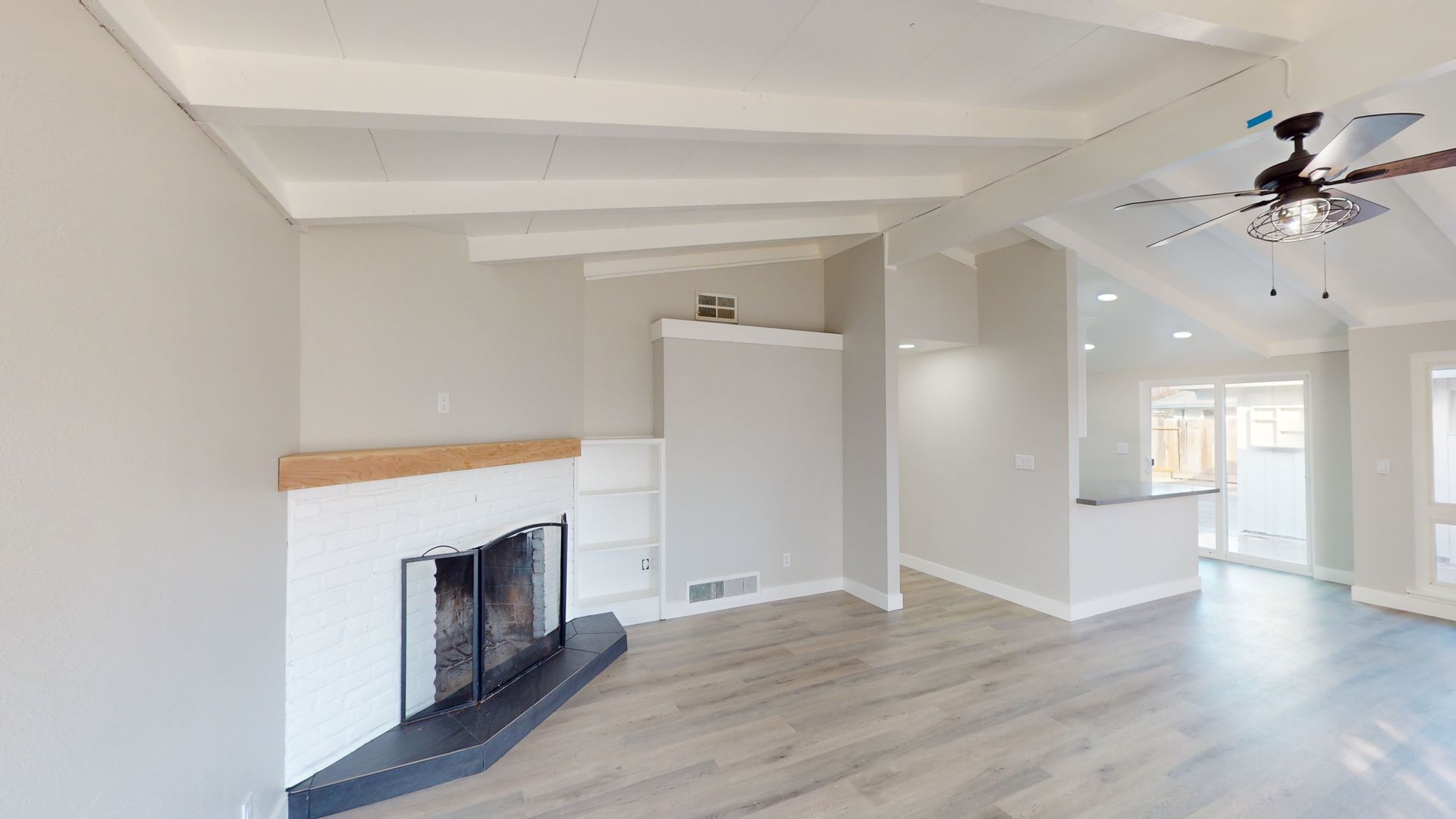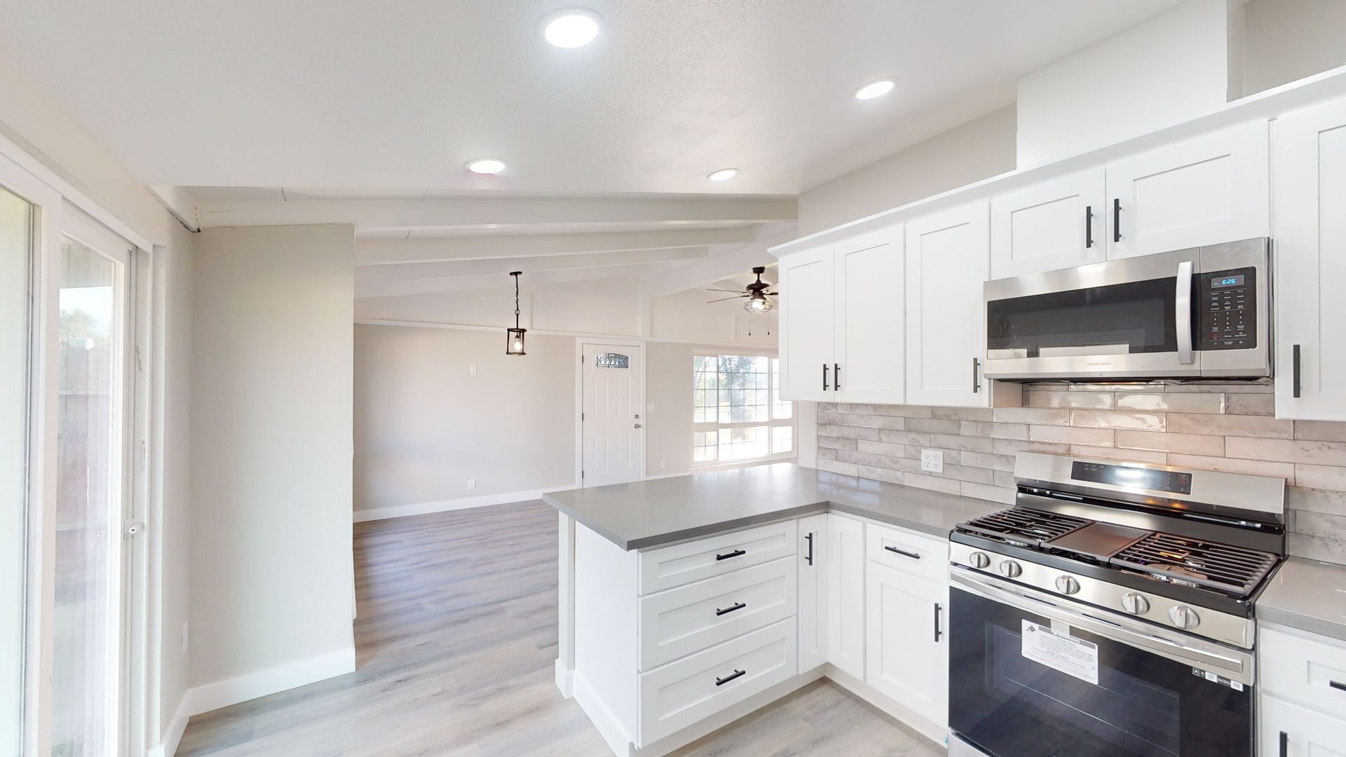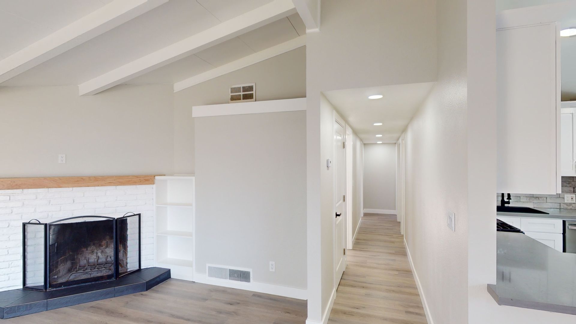 This is tastefully remolded home from the ceiling to the floors, it does not disappoint. Spacious open floor plan beautiful beamed ceiling and laminate flooring.